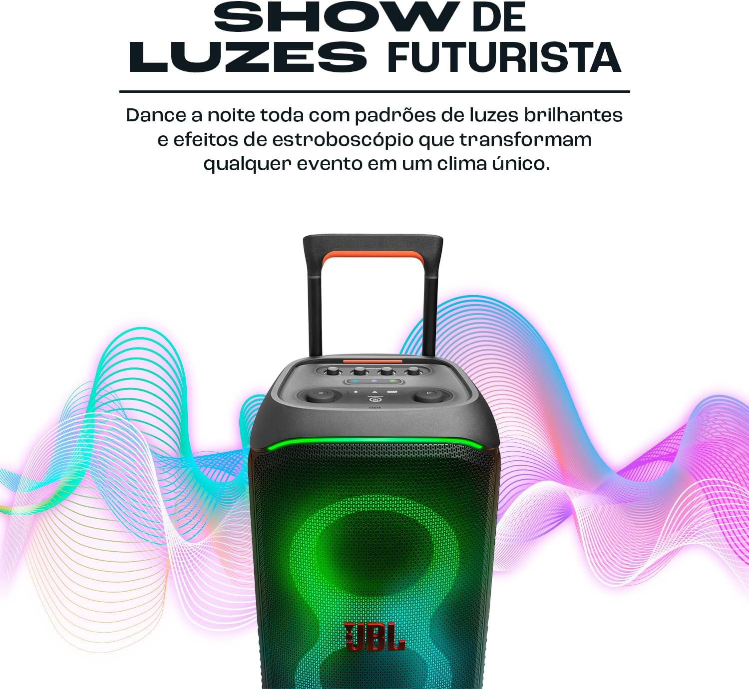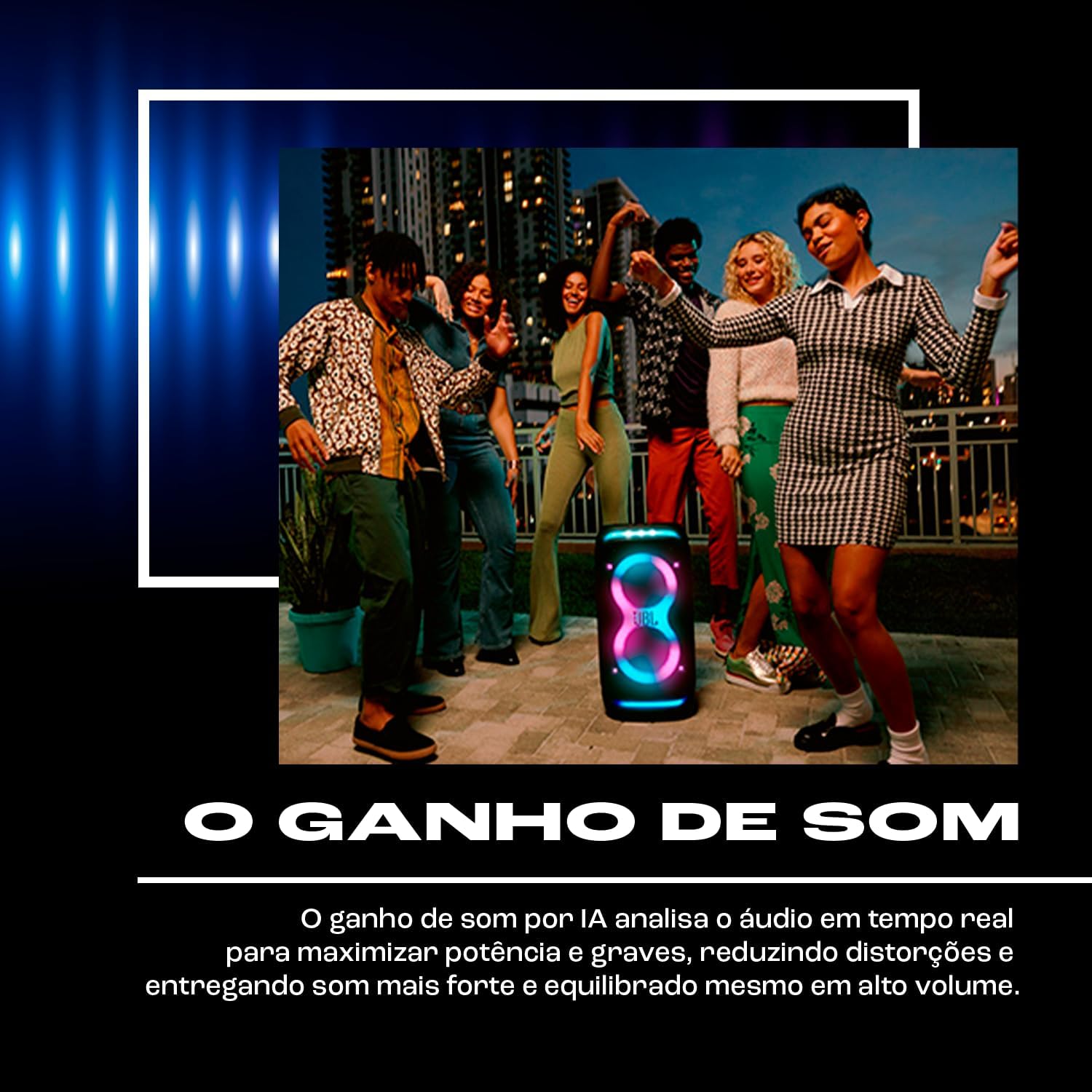 O emparelhamento com o JBL PartyBox Wireless Mic — microfone sem fio vendido separadamente por R$ 709,00 — expande as possibilidades para apresentações e karaokê profissional.