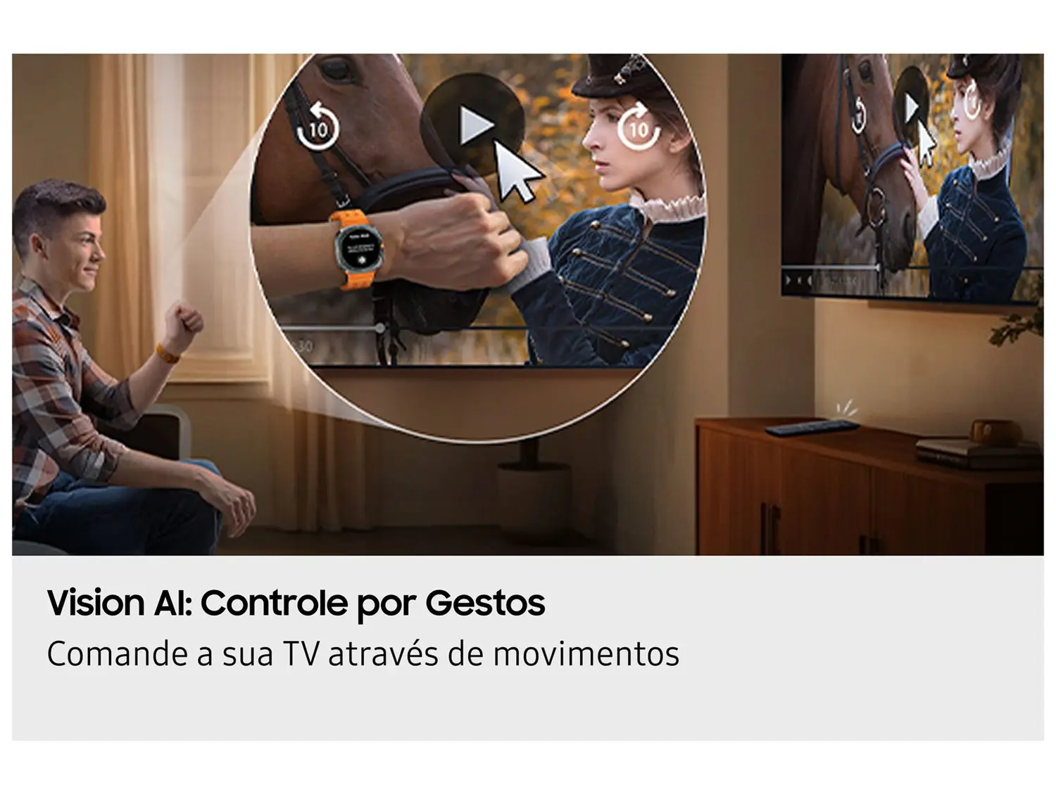Um diferencial que chama atenção: a função de plano de fundo generativo com IA transforma a tela em arte quando não está em uso — personalizando o ambiente da sala mesmo com a TV em modo de espera.
