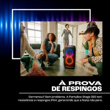 JBL, Caixa de Som, PartyBox Stage 320, Bluetooth, Portátil, Show de Luzes, À Prova de Respingos – 240W RMS – Preta